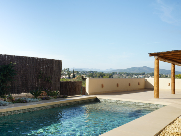 De buitenkant van de villa is een ruimte ontworpen voor ontspanning, met zijn goed onderhouden mediterrane tuin, turquoise waterzwembad en grote zonovergoten terrassen, ideaal voor familiemaaltijden in het milde klimaat van Jávea.