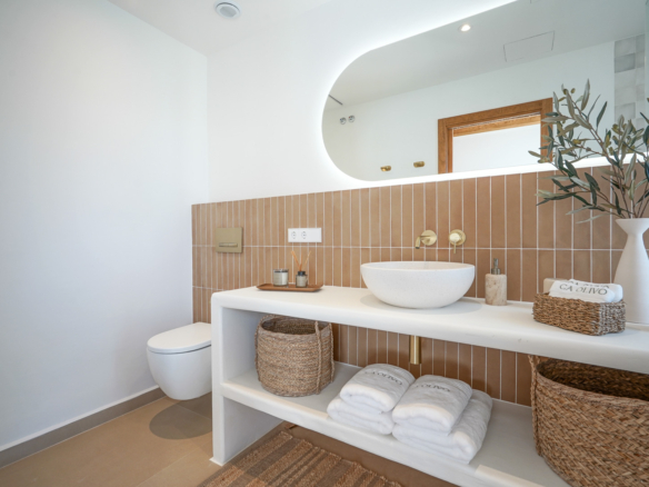 De villa is geheel gelijkvloers en beschikt over een ruime woon-eetkamer, een volledig uitgeruste keuken, een bijkeuken, drie comfortabele slaapkamers met inbouwkasten, drie en-suite badkamers en een gastentoilet.