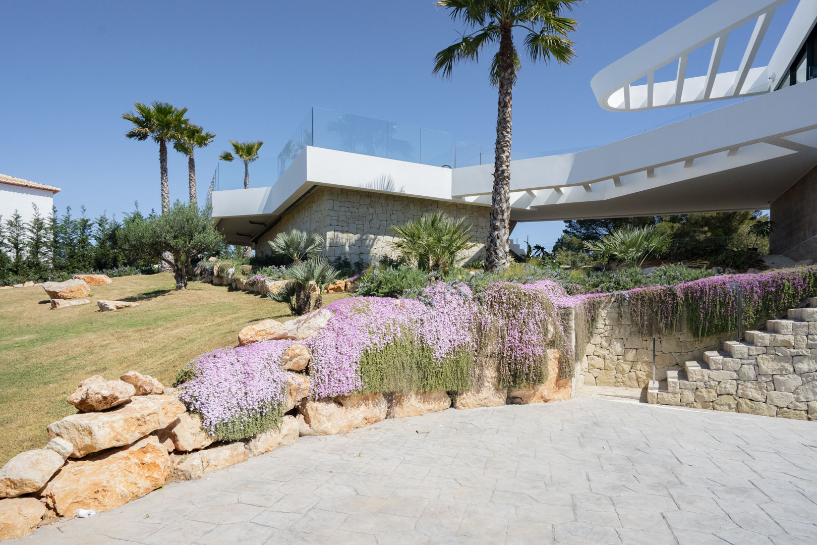De villa is omgeven door een prachtige mediterrane tuin met aromatische planten en bloemen die nauw aansluiten bij het design van deze unieke villa.