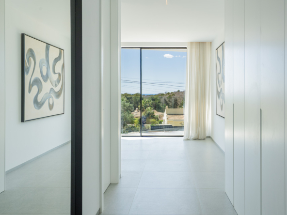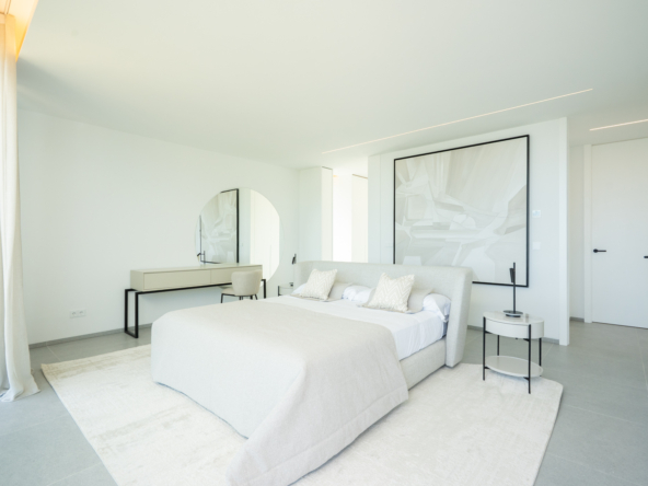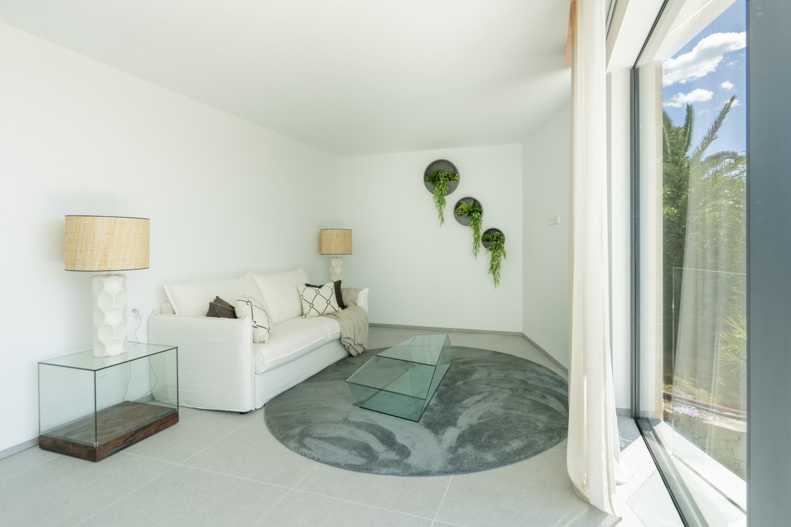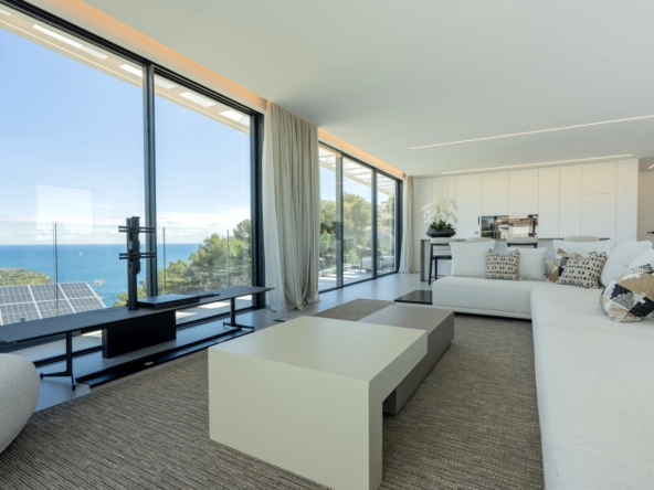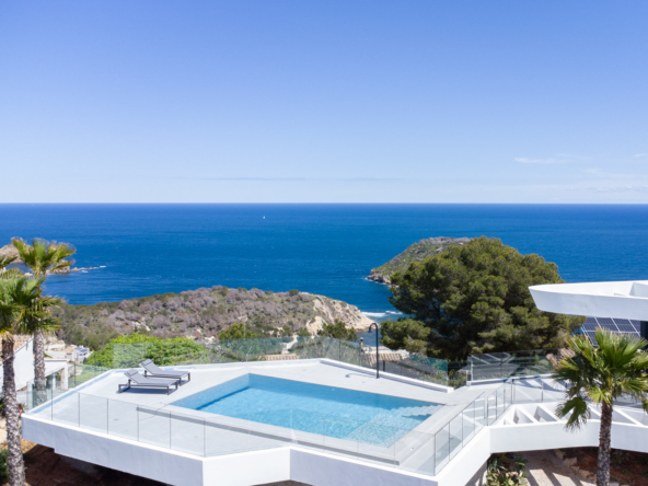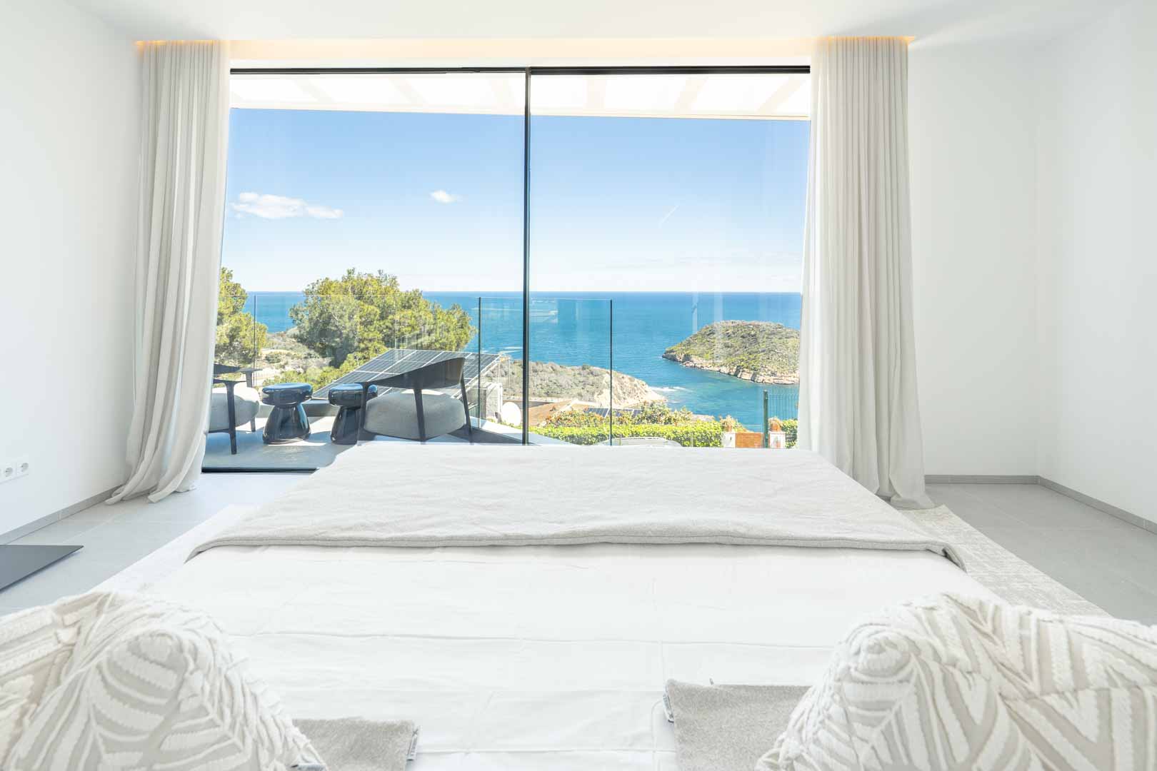 De villa met haar spectaculaire design is verdeeld over twee verdiepingen. Op de eerste verdieping is er een woonkamer met een designer keuken met een ruim kookeiland, een tweepersoons slaapkamer met een en suite badkamer met badkuip en inloopdouche en een zeer grote dressing. Vanuit deze slaapkamer geniet u een indrukwekkend uitzicht op de zee en op het eiland van Portichol. Deze verdieping herbergt ook een bijkeuken en een gastentoilet. Op de benedenverdieping zijn nog drie slaapkamers met elk een privé badkamer en uitzicht op zee. Alle slaapkamers zijn voorzien van meerdere vloer-tot-plafond kleerkasten. Grenzend aan de woonkamer is een terras met een ruim zwembad met een buitendouche. Vanuit het zwembad heeft u een panoramisch uitzicht op de rotsen aan Cap Marti, het eiland Portichol en het bergachtige binnenland. Het zwembad is voorzien van een zoutchloorzuiveringssysteem, met automatische afgifte, ingebouwde onderwaterschijnwerpers, een zuiveringsinstallatie, een automatische overdekking, een tegenstroom zwemsysteem en zitgedeelte met hydromassage.