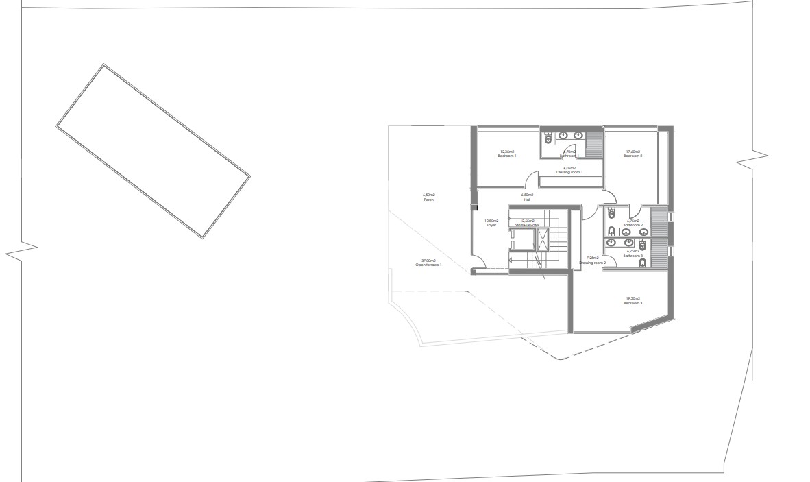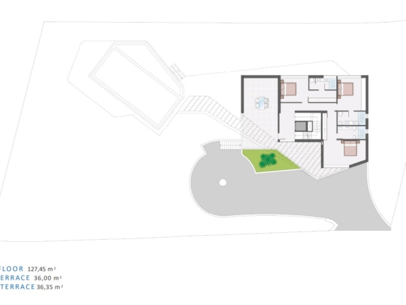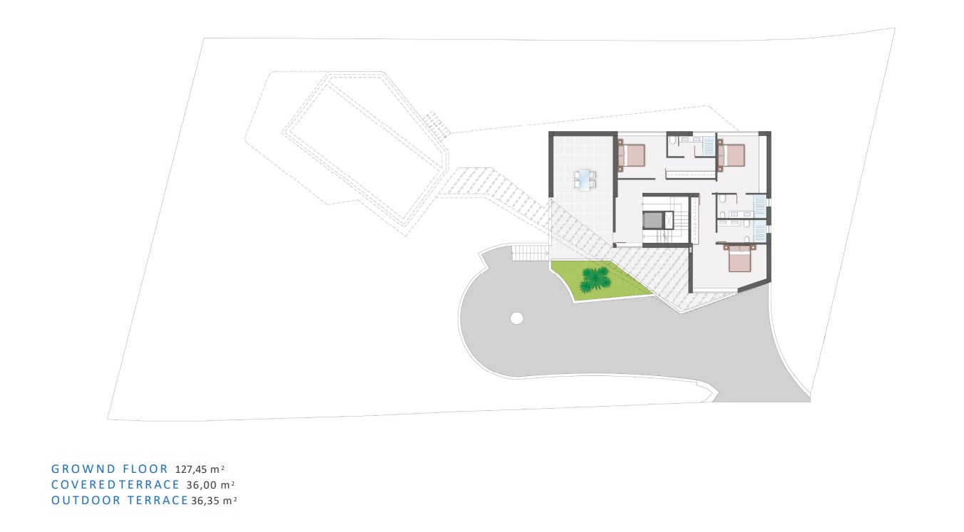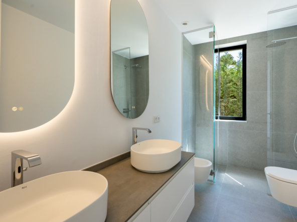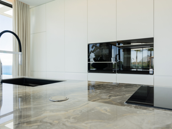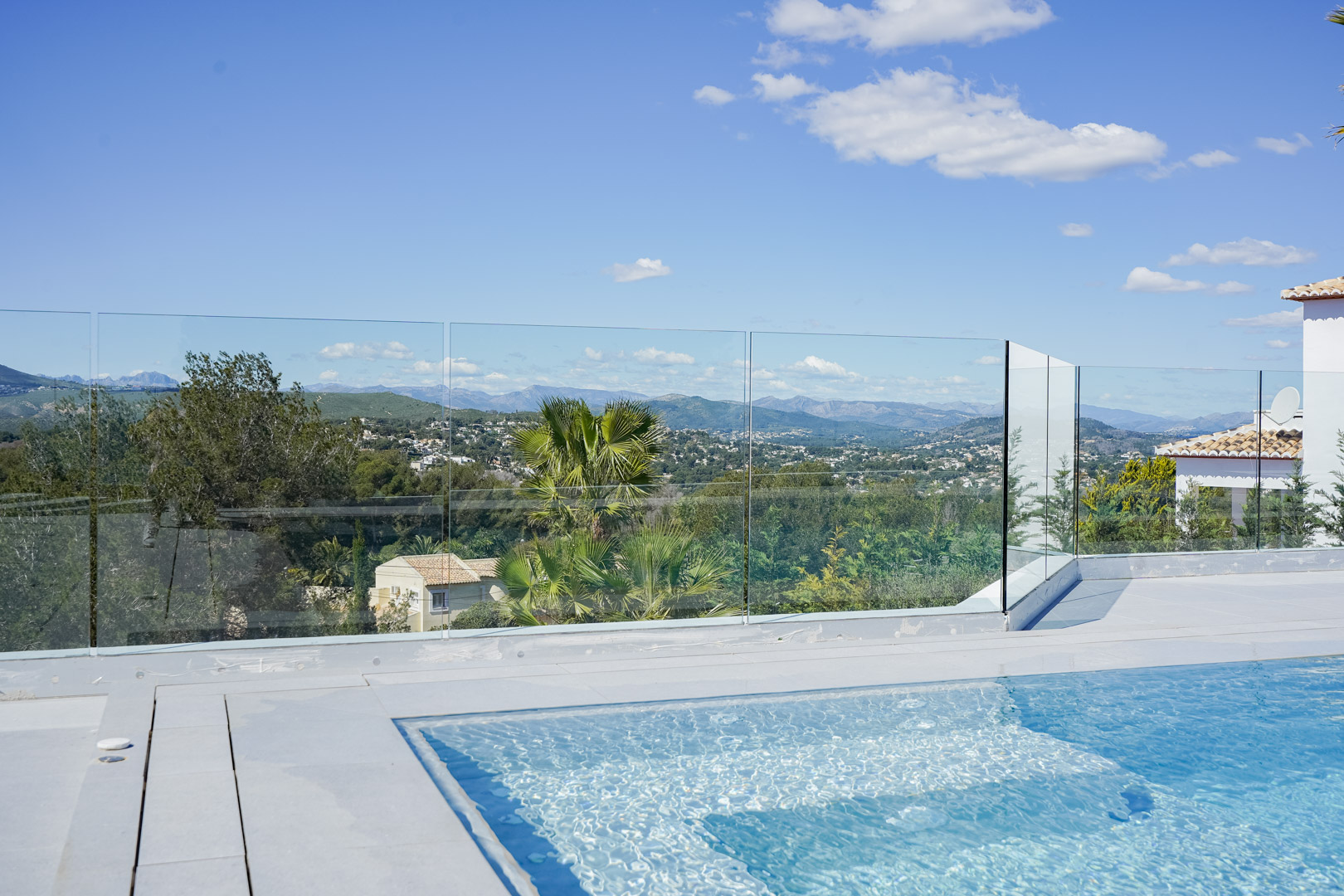 De villa met haar spectaculaire design is verdeeld over twee verdiepingen. Op de eerste verdieping is er een woonkamer met een designer keuken met een ruim kookeiland, een tweepersoons slaapkamer met een en suite badkamer met badkuip en inloopdouche en een zeer grote dressing. Vanuit deze slaapkamer geniet u een indrukwekkend uitzicht op de zee en op het eiland van Portichol. Deze verdieping herbergt ook een bijkeuken en een gastentoilet. Op de benedenverdieping zijn nog drie slaapkamers met elk een privé badkamer en uitzicht op zee. Alle slaapkamers zijn voorzien van meerdere vloer-tot-plafond kleerkasten. Grenzend aan de woonkamer is een terras met een ruim zwembad met een buitendouche. Vanuit het zwembad heeft u een panoramisch uitzicht op de rotsen aan Cap Marti, het eiland Portichol en het bergachtige binnenland. Het zwembad is voorzien van een zoutchloorzuiveringssysteem, met automatische afgifte, ingebouwde onderwaterschijnwerpers, een zuiveringsinstallatie, een automatische overdekking, een tegenstroom zwemsysteem en zitgedeelte met hydromassage.