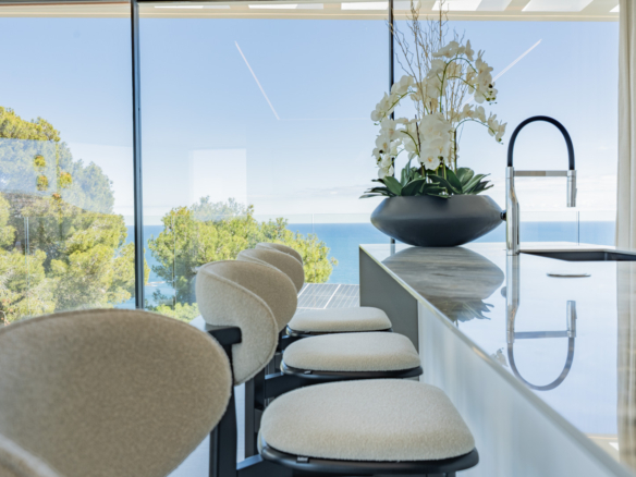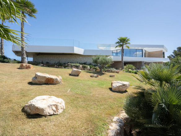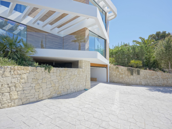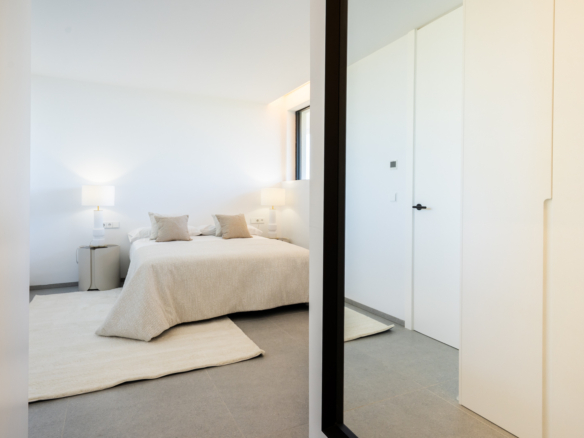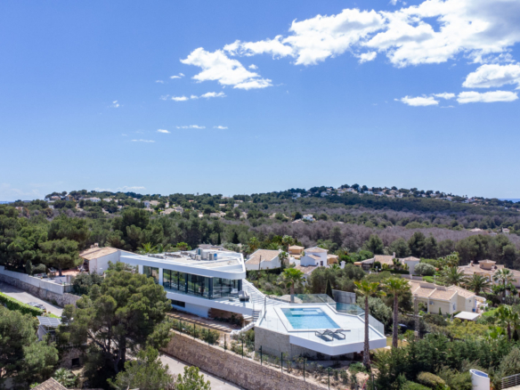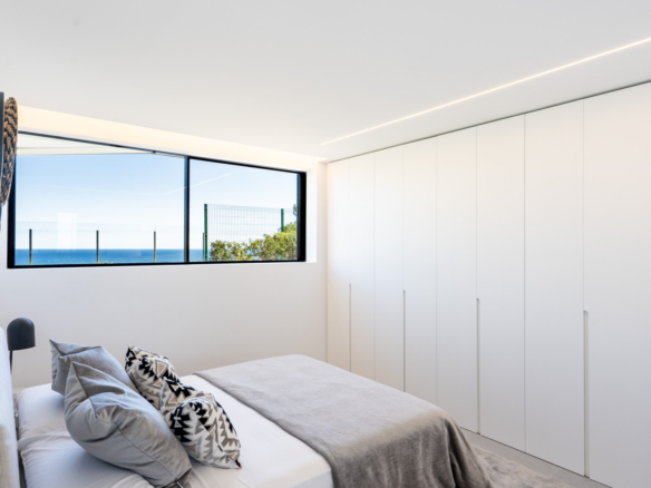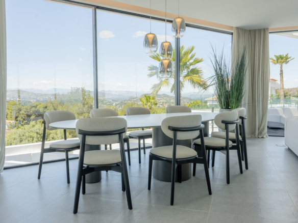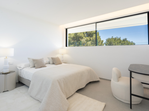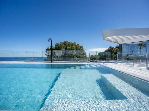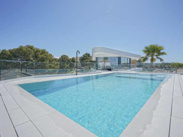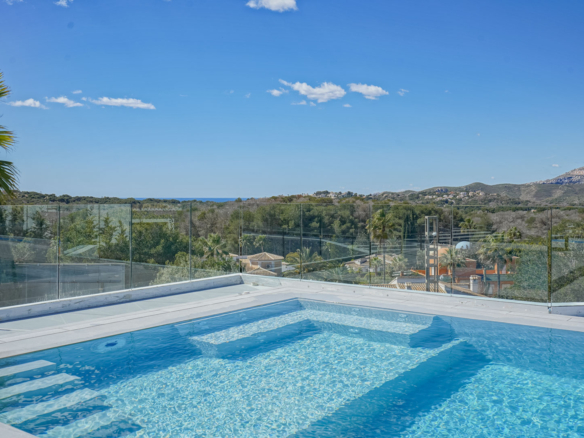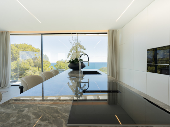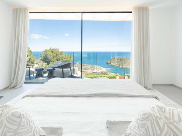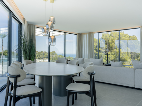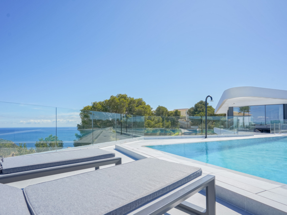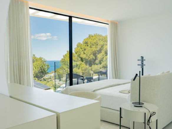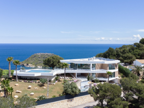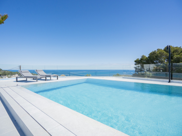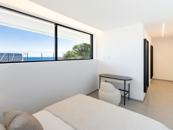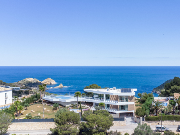De villa met haar spectaculaire design is verdeeld over twee verdiepingen. Op de eerste verdieping is er een woonkamer met een designer keuken met een ruim kookeiland, een tweepersoons slaapkamer met een en suite badkamer met badkuip en inloopdouche en een zeer grote dressing. Vanuit deze slaapkamer geniet u een indrukwekkend uitzicht op de zee en op het eiland van Portichol. Deze verdieping herbergt ook een bijkeuken en een gastentoilet. Op de benedenverdieping zijn nog drie slaapkamers met elk een privé badkamer en uitzicht op zee. Alle slaapkamers zijn voorzien van meerdere vloer-tot-plafond kleerkasten. Grenzend aan de woonkamer is een terras met een ruim zwembad met een buitendouche. Vanuit het zwembad heeft u een panoramisch uitzicht op de rotsen aan Cap Marti, het eiland Portichol en het bergachtige binnenland. Het zwembad is voorzien van een zoutchloorzuiveringssysteem, met automatische afgifte, ingebouwde onderwaterschijnwerpers, een zuiveringsinstallatie, een automatische overdekking, een tegenstroom zwemsysteem en zitgedeelte met hydromassage.