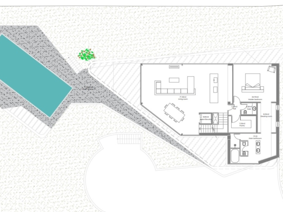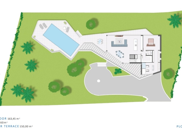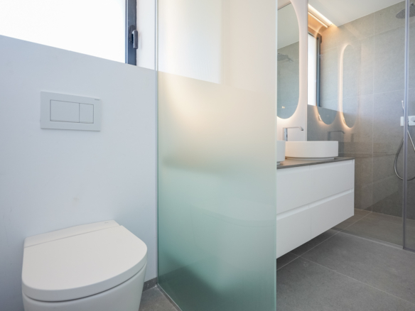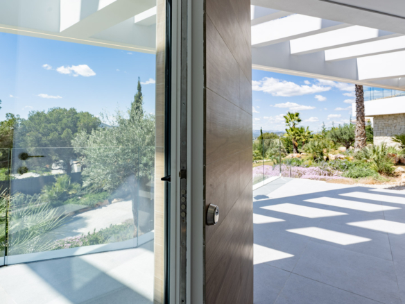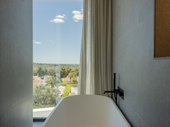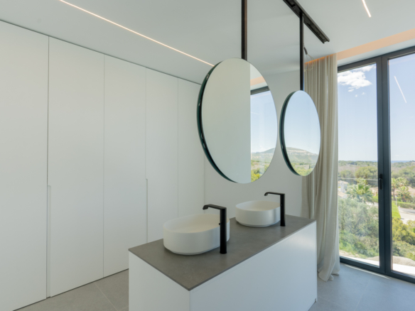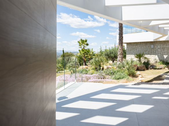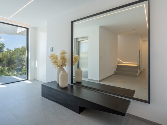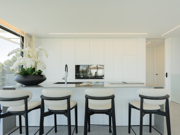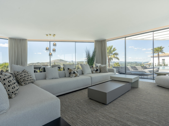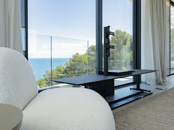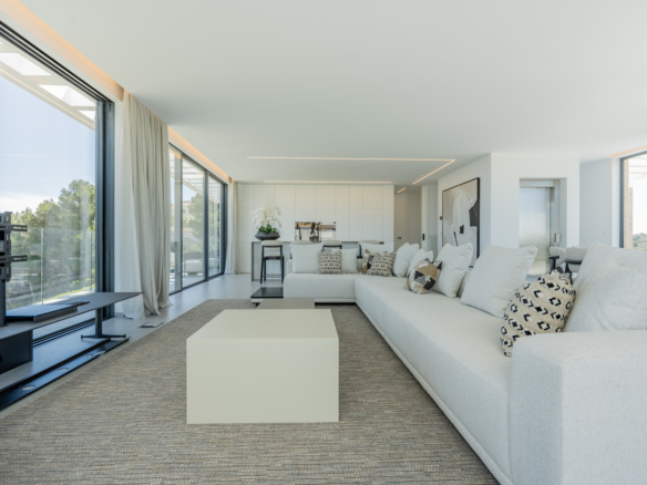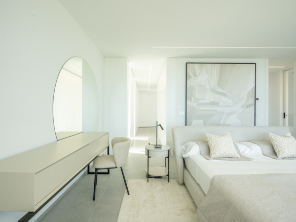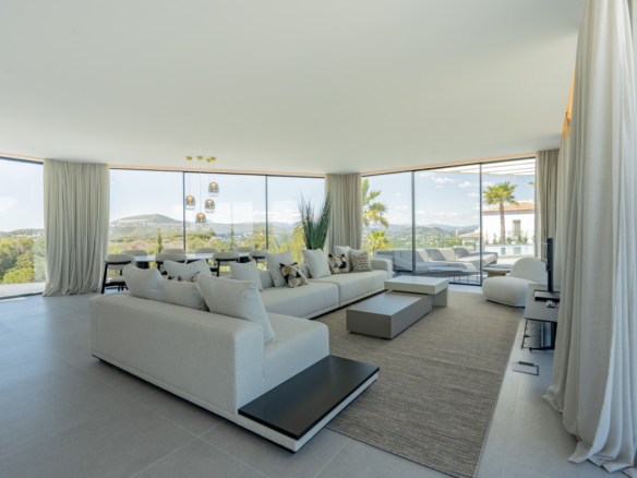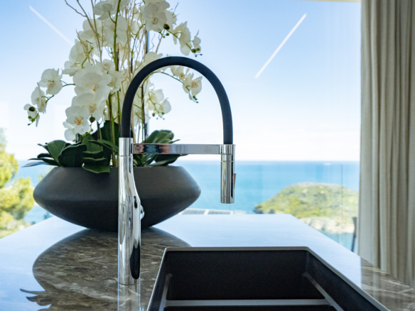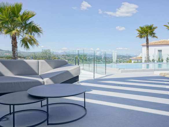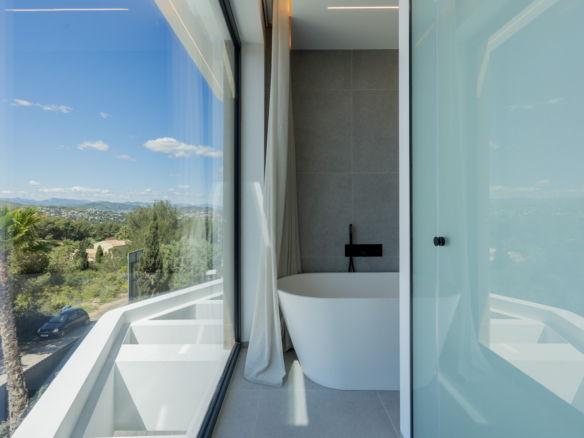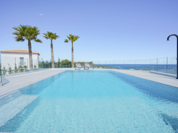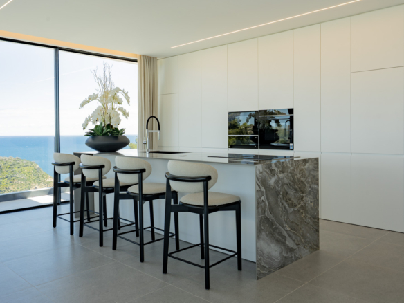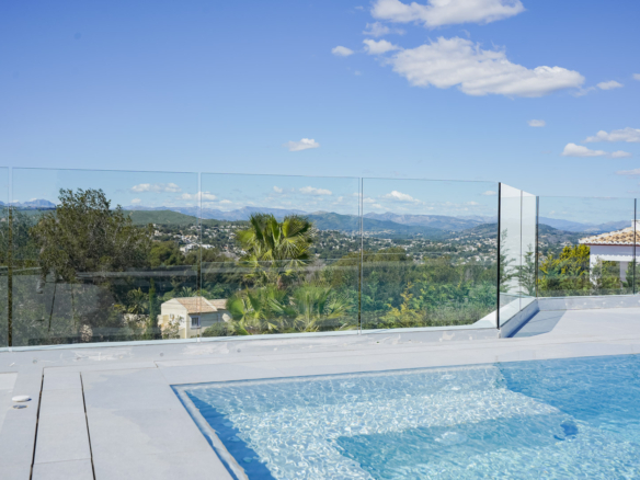 De villa met haar spectaculaire design is verdeeld over twee verdiepingen. Op de eerste verdieping is er een woonkamer met een designer keuken met een ruim kookeiland, een tweepersoons slaapkamer met een en suite badkamer met badkuip en inloopdouche en een zeer grote dressing. Vanuit deze slaapkamer geniet u een indrukwekkend uitzicht op de zee en op het eiland van Portichol. Deze verdieping herbergt ook een bijkeuken en een gastentoilet. Op de benedenverdieping zijn nog drie slaapkamers met elk een privé badkamer en uitzicht op zee. Alle slaapkamers zijn voorzien van meerdere vloer-tot-plafond kleerkasten. Grenzend aan de woonkamer is een terras met een ruim zwembad met een buitendouche. Vanuit het zwembad heeft u een panoramisch uitzicht op de rotsen aan Cap Marti, het eiland Portichol en het bergachtige binnenland. Het zwembad is voorzien van een zoutchloorzuiveringssysteem, met automatische afgifte, ingebouwde onderwaterschijnwerpers, een zuiveringsinstallatie, een automatische overdekking, een tegenstroom zwemsysteem en zitgedeelte met hydromassage.