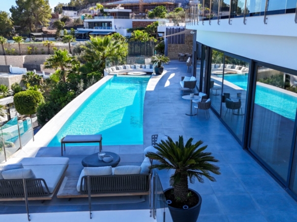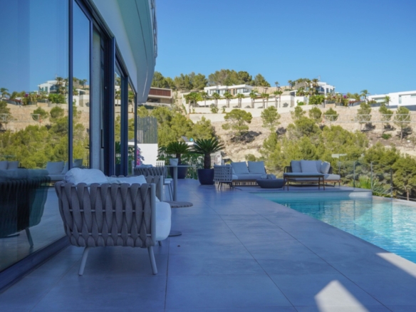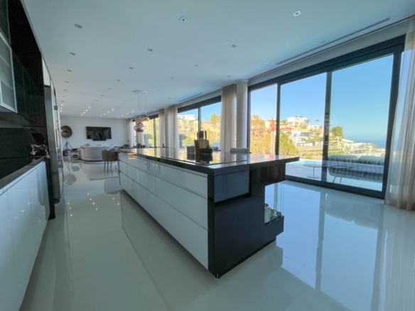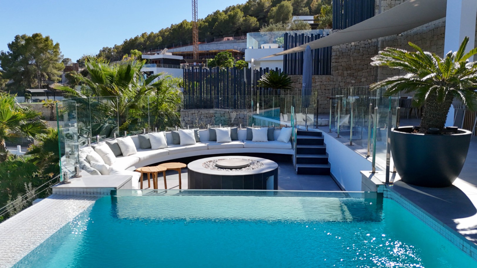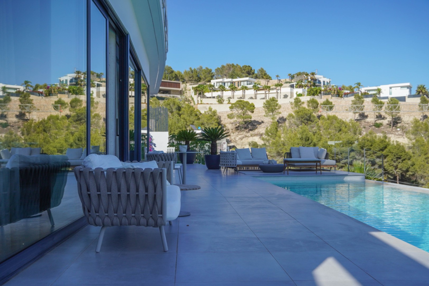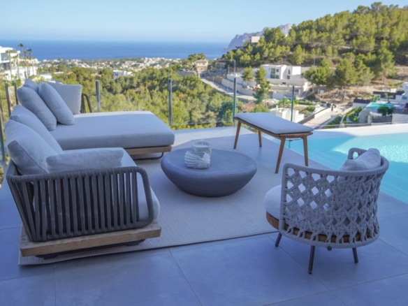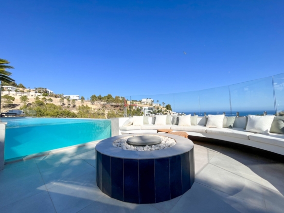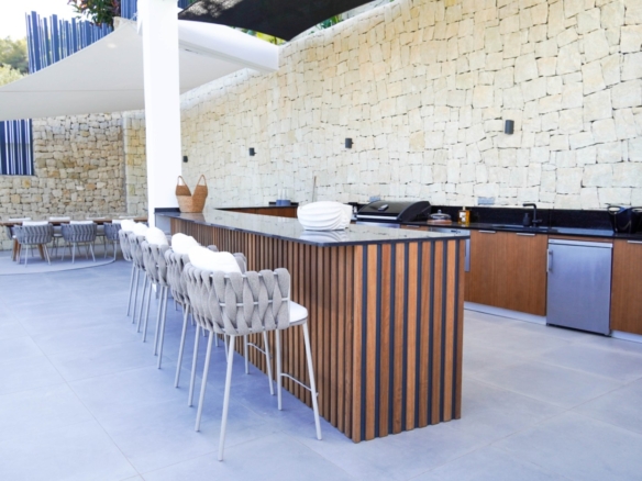 Buitenruimte: De buitenruimte van het huis is ontworpen om optimaal te genieten van de levenskwaliteit die de Costa Blanca te bieden heeft. Het heeft een nieuwe zomerkeuken, jacuzzi, overloopzwembad en een lounge met buitenbarbecue, ideaal om te ontspannen en te genieten van het prachtige uitzicht op zee.
