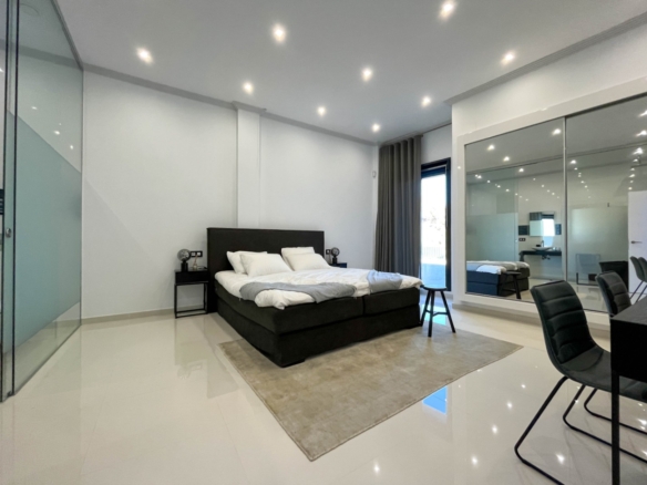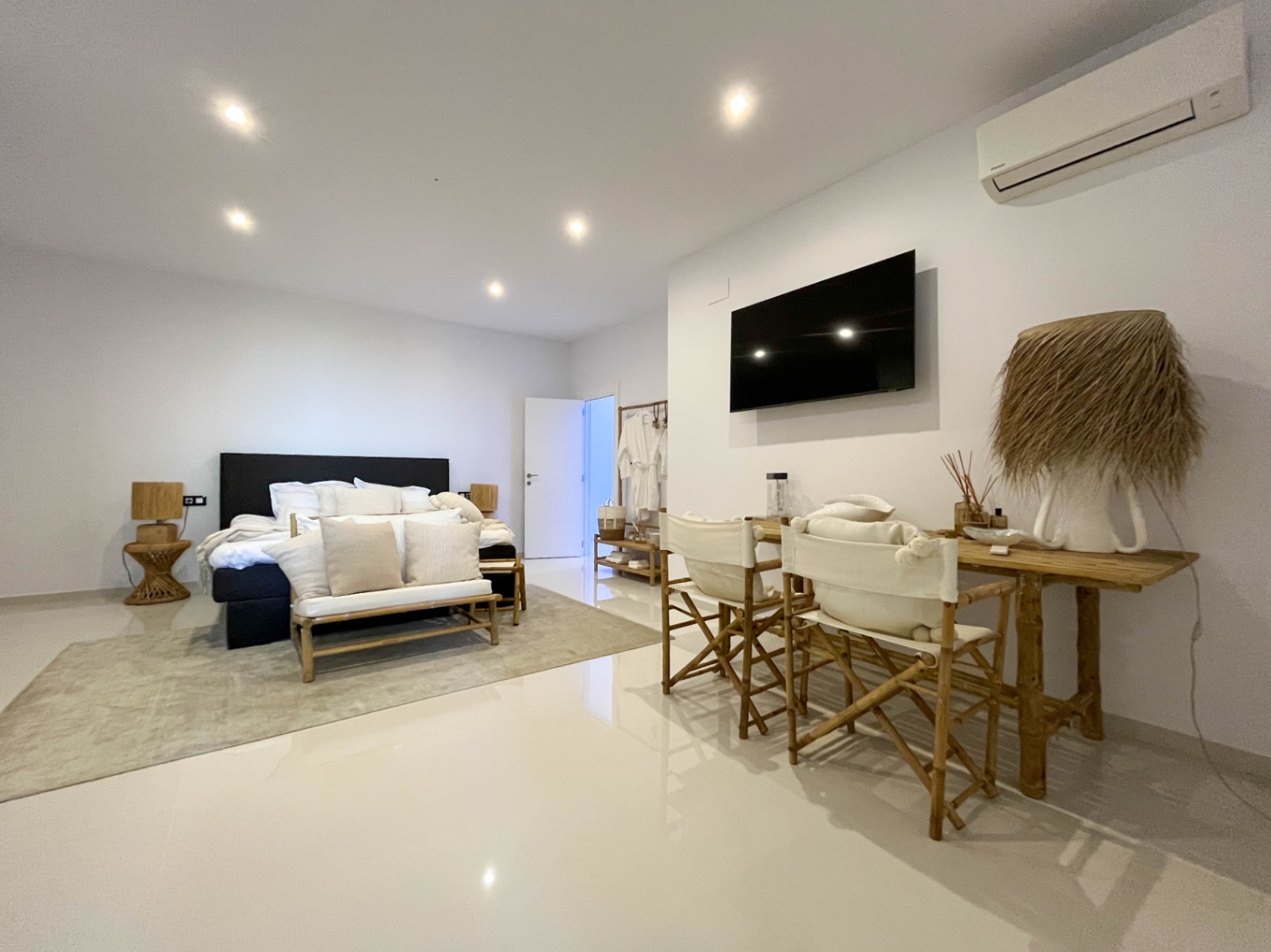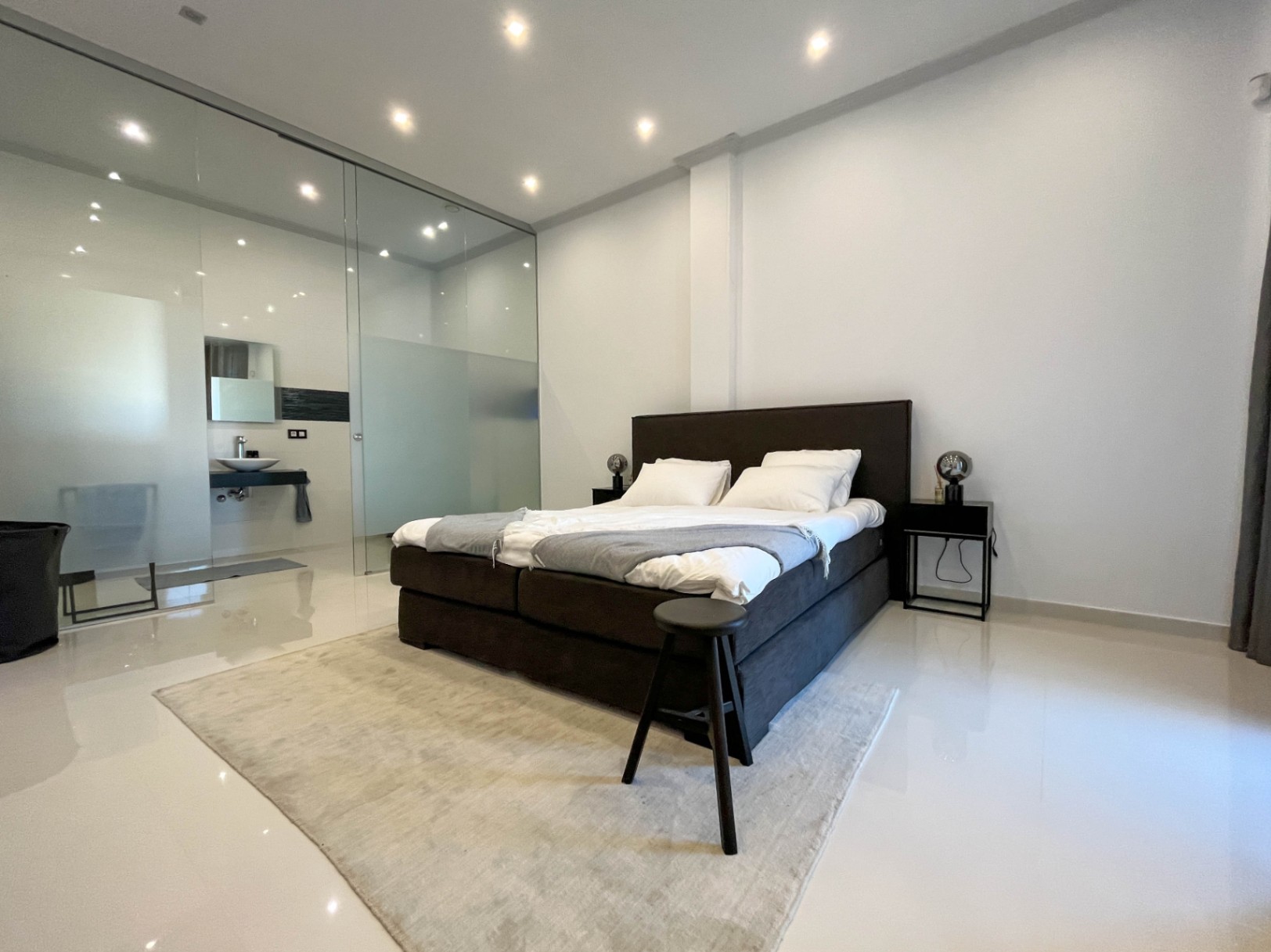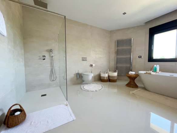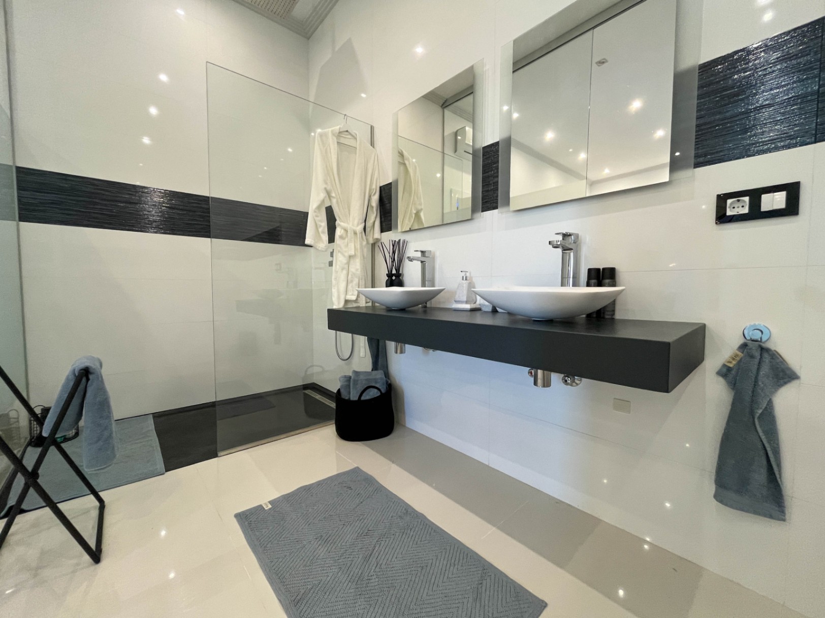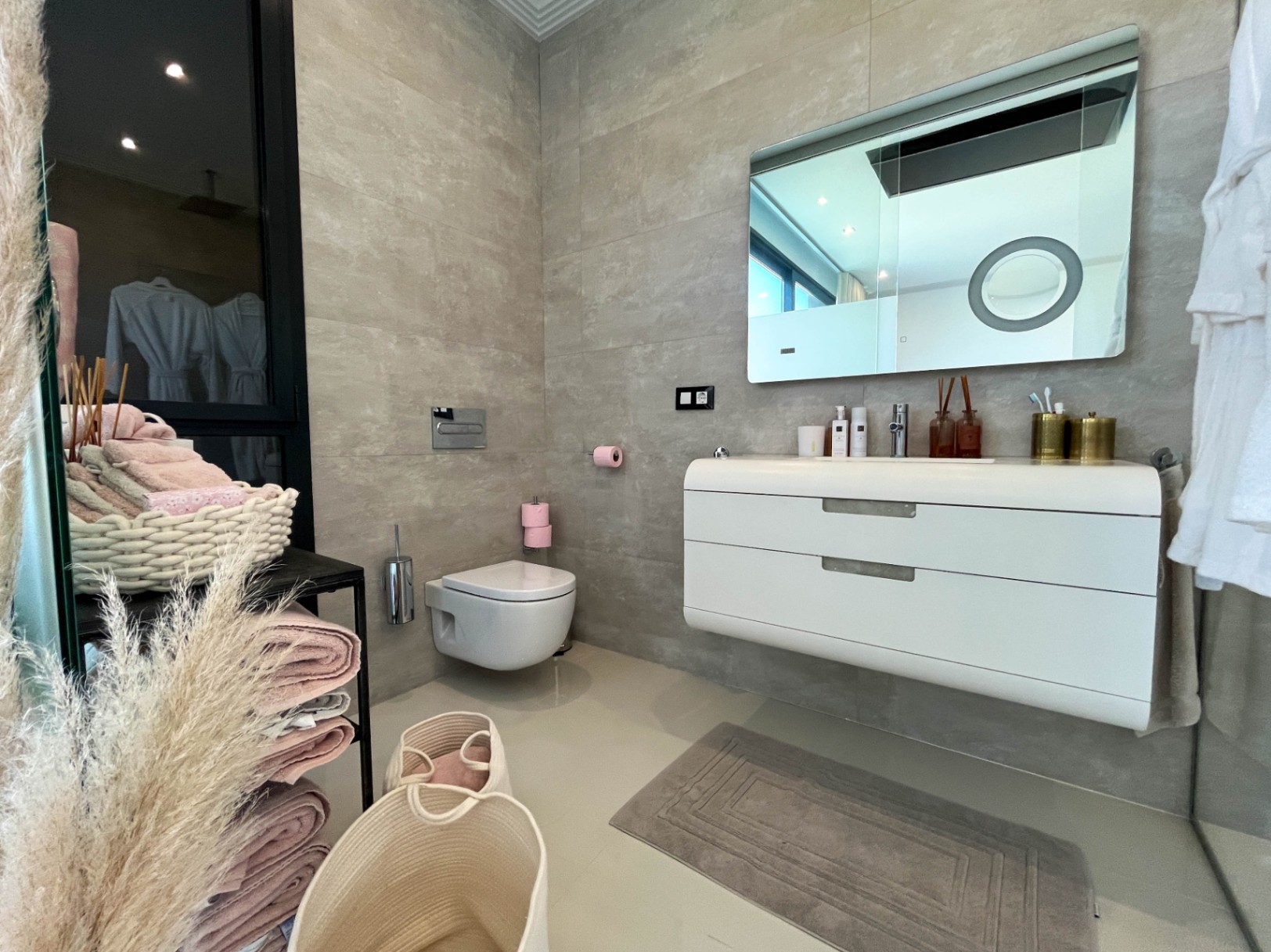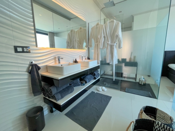 Bovenverdieping: Op de eerste verdieping bevinden zich drie tweepersoonsslaapkamers, elk met een eigen badkamer en een modern tv-systeem weggewerkt in het plafond. Bovendien biedt een groot terras fascinerend uitzicht op zee, waardoor het de perfecte plek is om te ontspannen en te genieten van de omgeving.