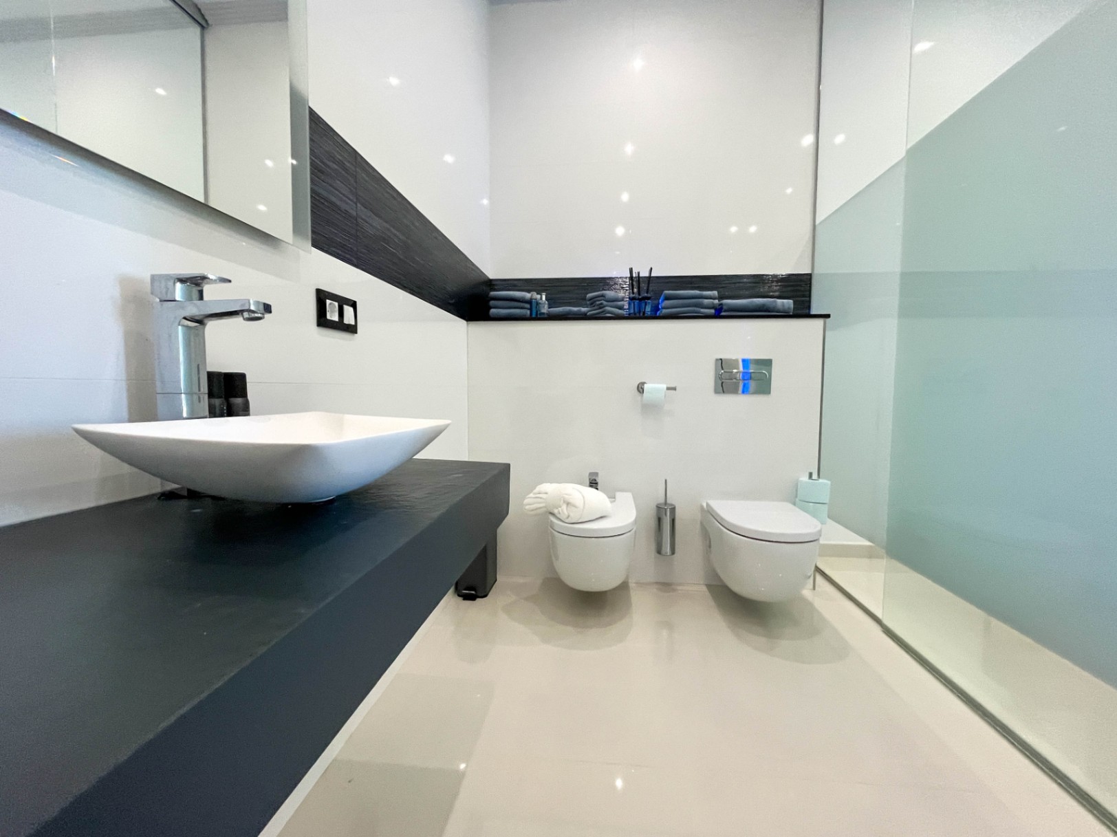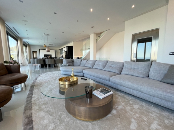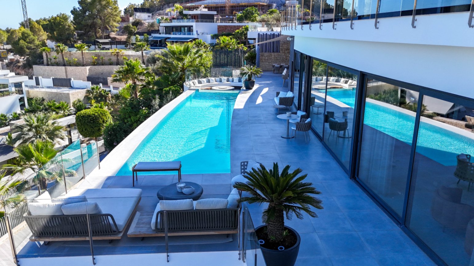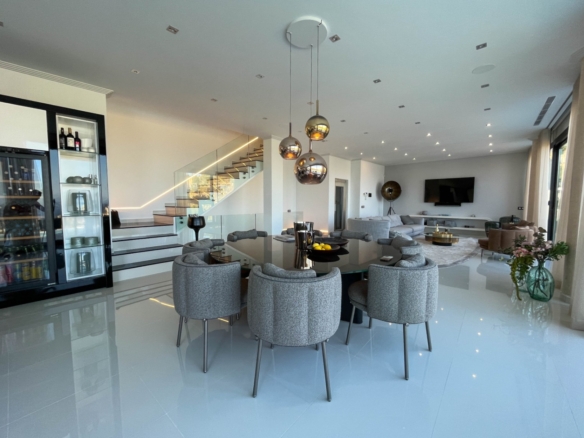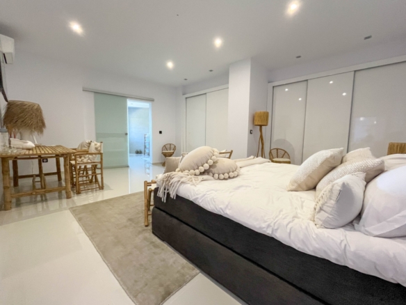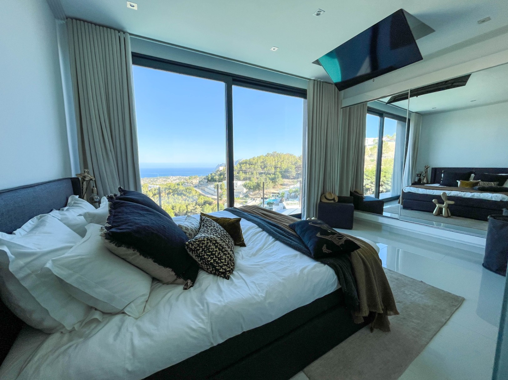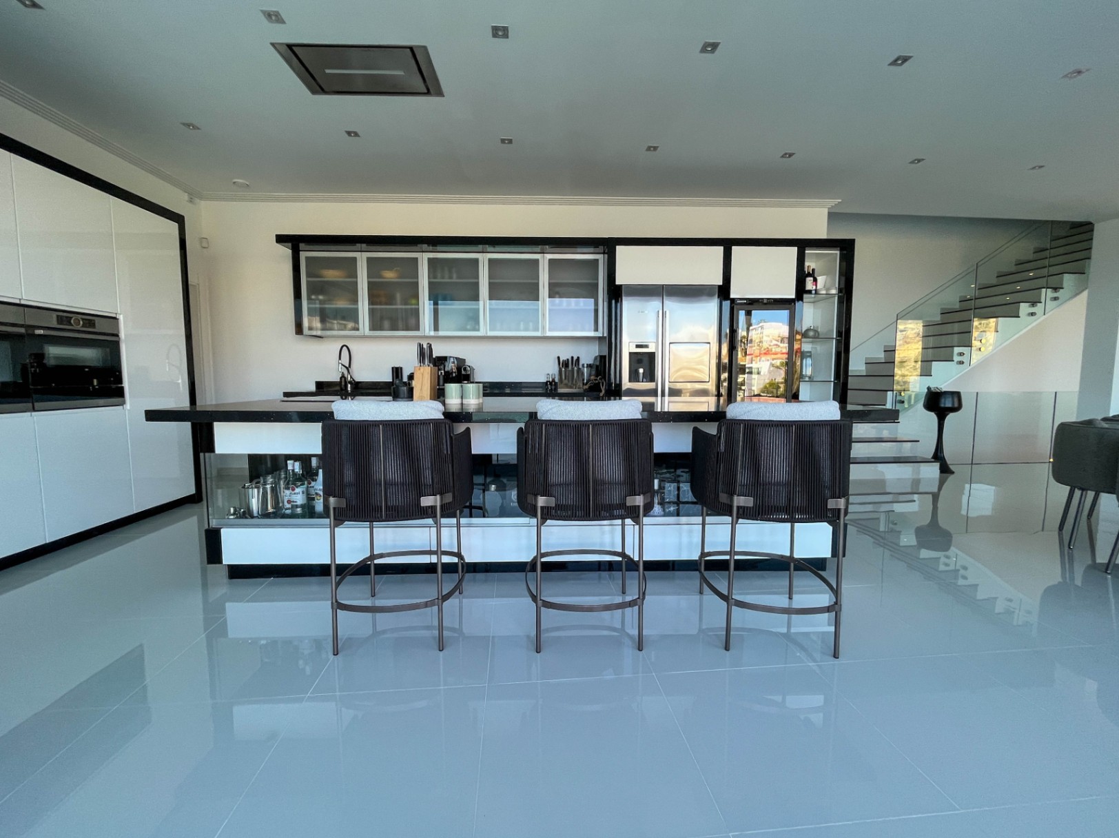 Bovenverdieping: Op de eerste verdieping bevinden zich drie tweepersoonsslaapkamers, elk met een eigen badkamer en een modern tv-systeem weggewerkt in het plafond. Bovendien biedt een groot terras fascinerend uitzicht op zee, waardoor het de perfecte plek is om te ontspannen en te genieten van de omgeving.