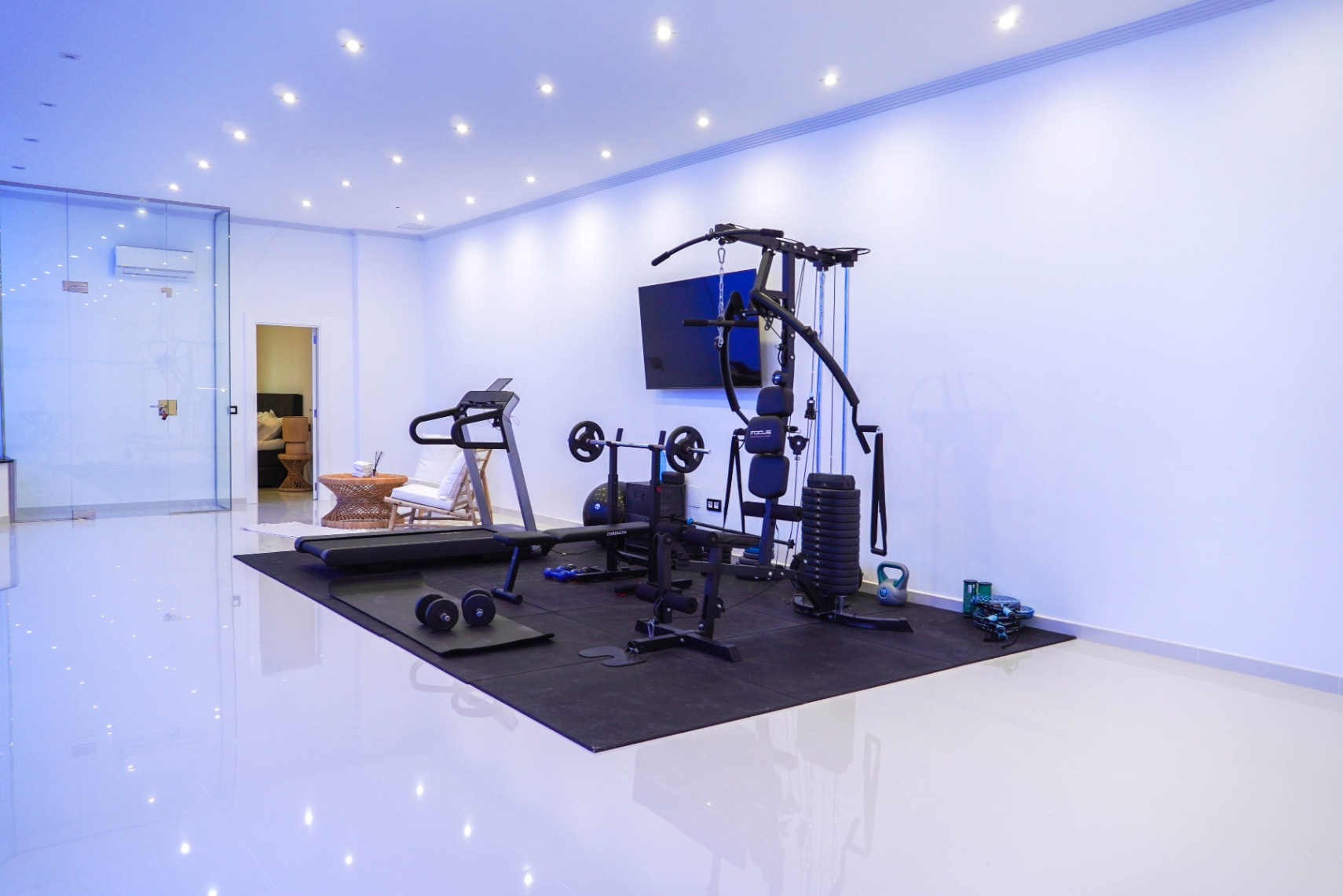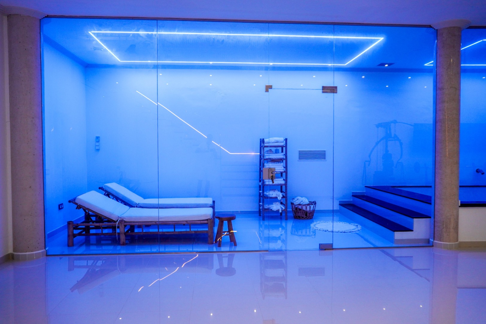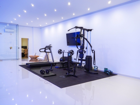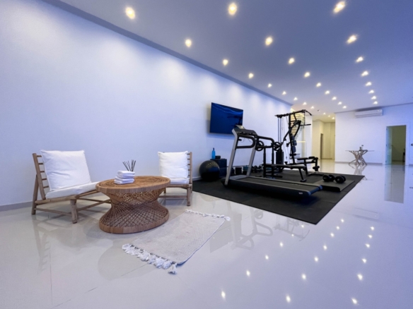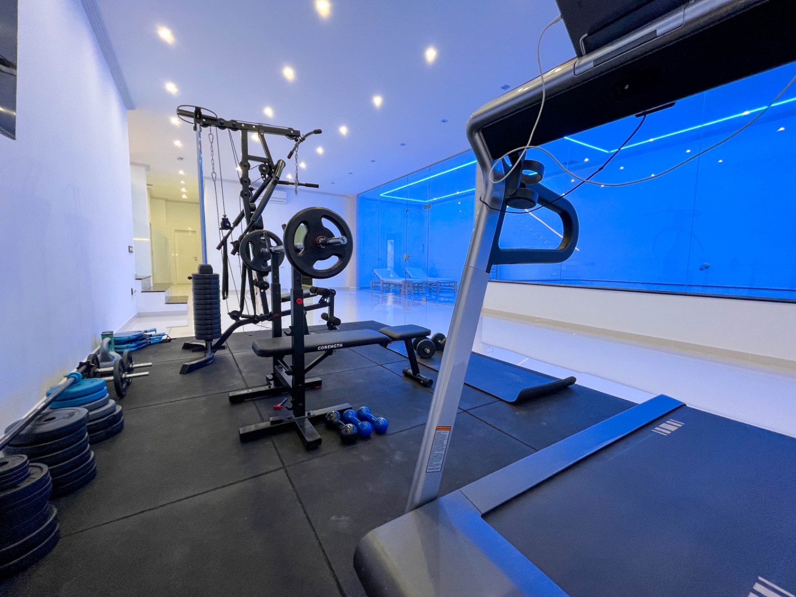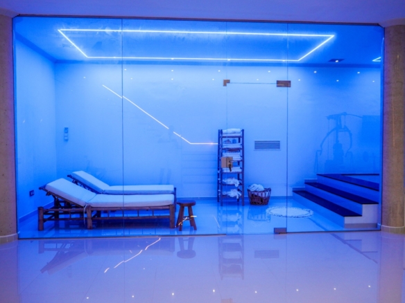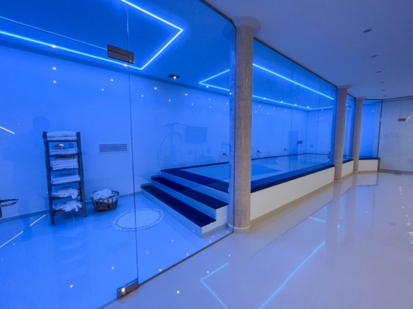 Kelderverdieping: De kelderverdieping is een ware wellnessoase, met een spectaculaire spa, een fitnessruimte en een zwembad dat wordt verwarmd door zonnepanelen. Op dit niveau zijn er ook twee slaapkamers (een in Ibizastijl) met en-suite badkamers.