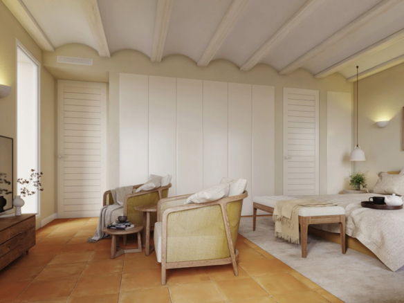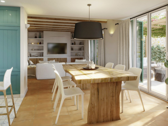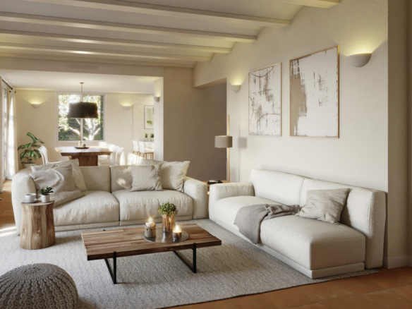 Het interieur van de woningen ademt rust en comfort. Grote ramen laten veel natuurlijk licht binnen, waardoor elke ruimte helder en aangenaam aanvoelt. De woon-eetkamer is ingericht met warme tinten, mediterrane elementen en natuurlijke materialen, wat zorgt voor een gezellige en uitnodigende sfeer. De keuken is praktisch ingericht met in elk model aangrenzend een bijkeuken. Elke villa beschikt over drie moderne badkamers en een gastentoilet. Zowel de geschakelde woningen als de vrijstaande villa’s zijn georiënteerd op het zuiden en beschikken naast een privétuin over een terras met een pergola. Het complex beschikt ook over een gemeenschappelijk zwembad van 75 m2, met schaduwzones, ligruimtes en gemeenschappelijke wifi. Ook zullen er zonnepanelen geïnstalleerd worden voor het energieverbruik van de gemeenschappelijke zones. Er zullen zonnepanelen geïnstalleerd worden voor het energieverbruik van de gemeenschappelijke zones.