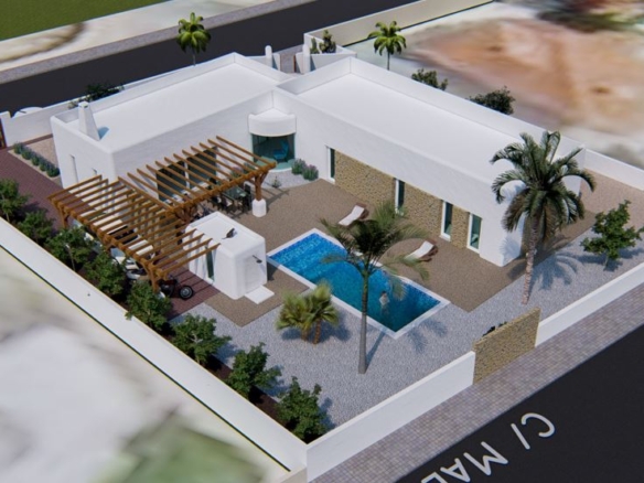 Deze prachtige Ibiziaanse villa zal gebouwd worden in een rustige wijk in Alfaz del Pi op minder dan 10 minuten van het idyllische strand van Albir. De woning heeft een ruime woonkamer en keuken die warm zijn aangezet door houttinten in de plafondbalken, wandbetimmeringen en keukenkastjes. Via de eetkamer kom je via een groot schuifraam dat verdwijnt in de muur op de pergola die aangrenzend aan het zwembad ligt. Daarnaast zijn er nog 3 slaapkamers waarvan 1 met ensuite badkamer, een extra badkamer, een studeerkamer en een wasruimte. Ook is er een grote oprit met een pergola over de parkeerplaats en een opslagruimte buiten.